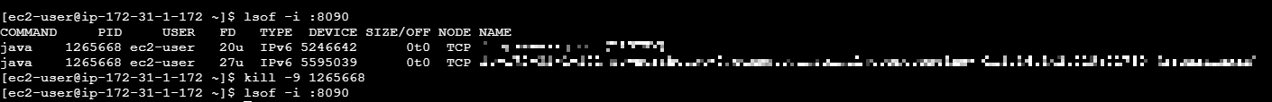 실제로 아래를 보면 8090을 사용중인 프로세스를 강제 종료한 것.