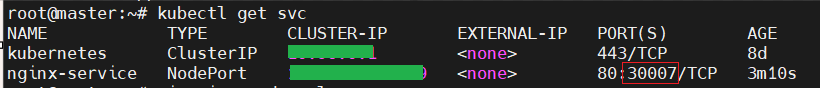 nginx-service가 목록에 나타나고, NodePort에 지정한 포트(30007)가 연결된 것을 확인