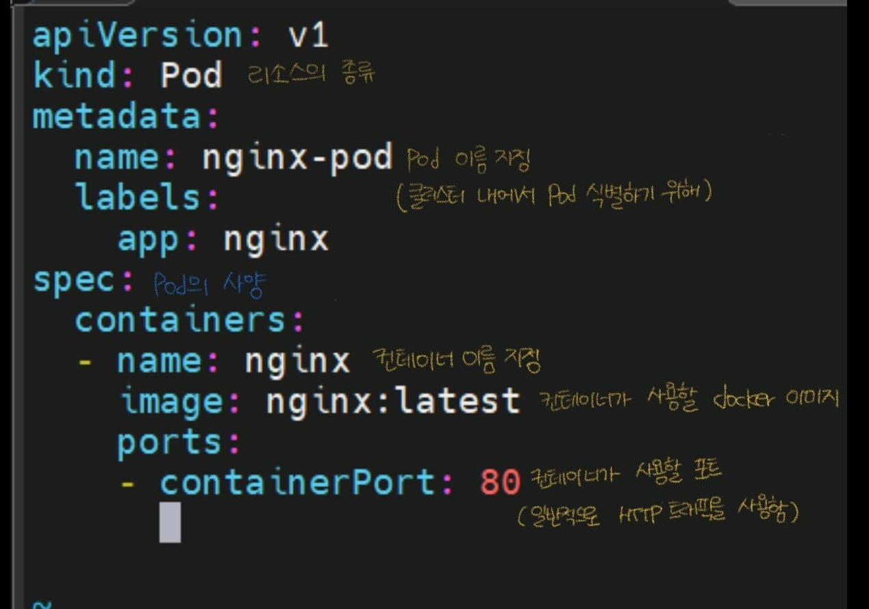 이 Pod은 nginx:latest 이미지를 기반으로 하고, 웹 트래픽을 처리하기 위해 80번 포트를 엽니다.