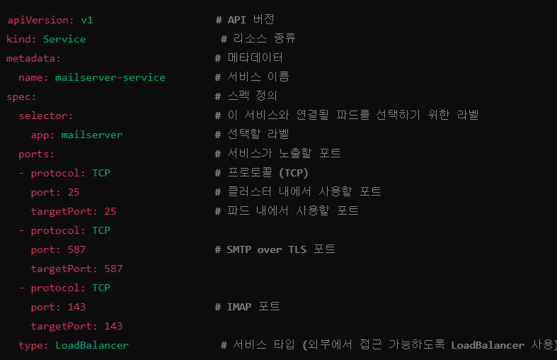 - Service: mailserver 파드에 대한 접근을 외부에서 가능하게 해줌. LoadBalancer 타입은 클라우드 서비스에서 자동으로 외부 IP 주소를 할당하여 인터넷에서 접근할 수 있게 만듦.