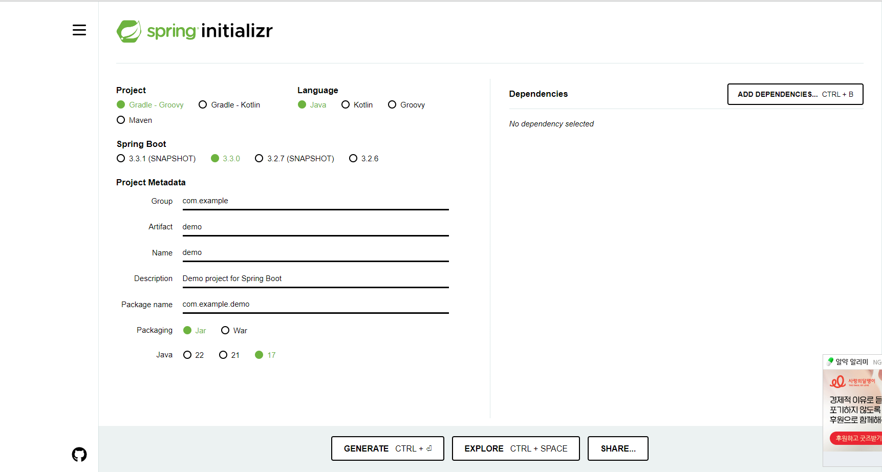 그리고 우측에 ADD DEPENDENCIES 를 클릭해 원하는 모듈을 설치할 수 있다